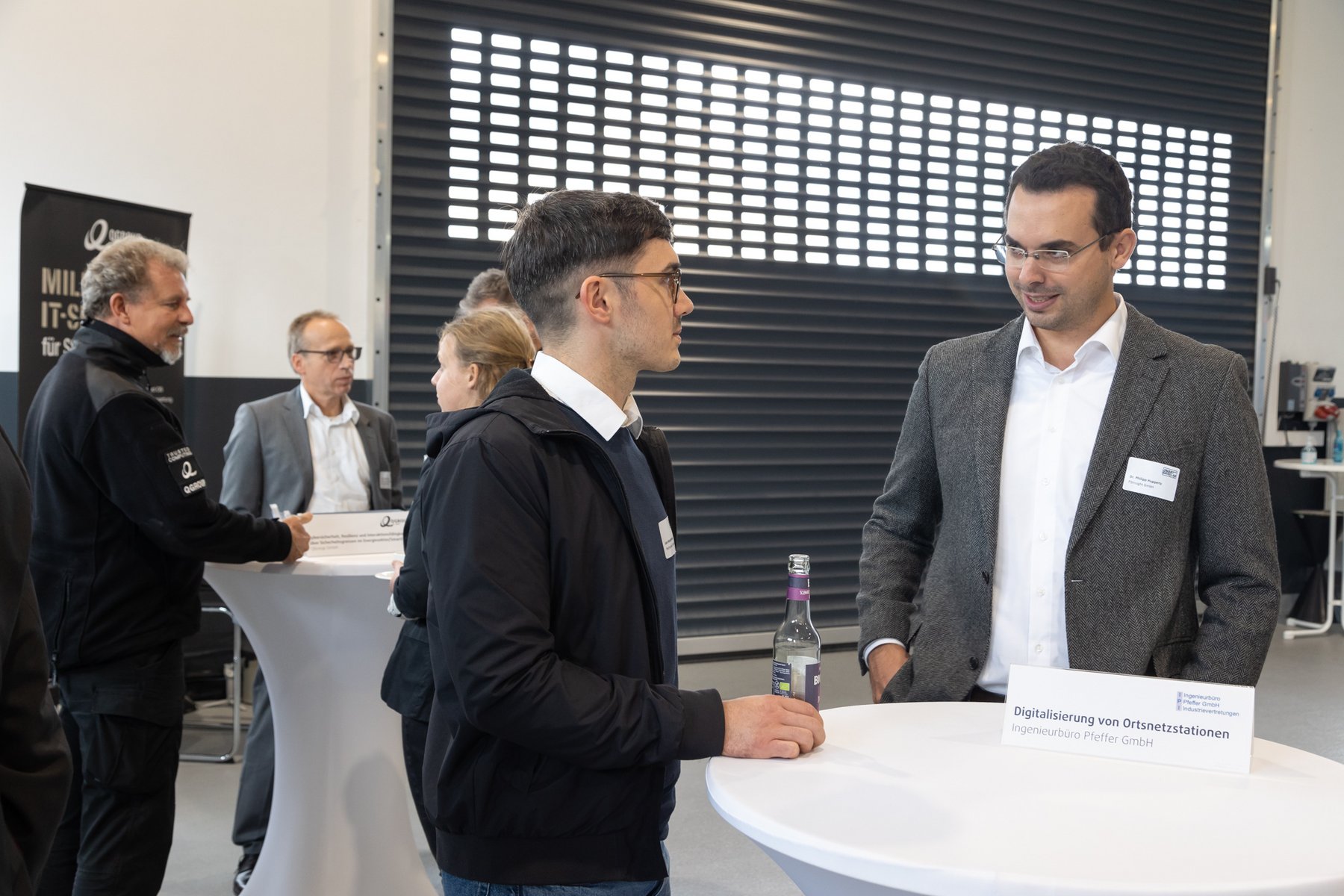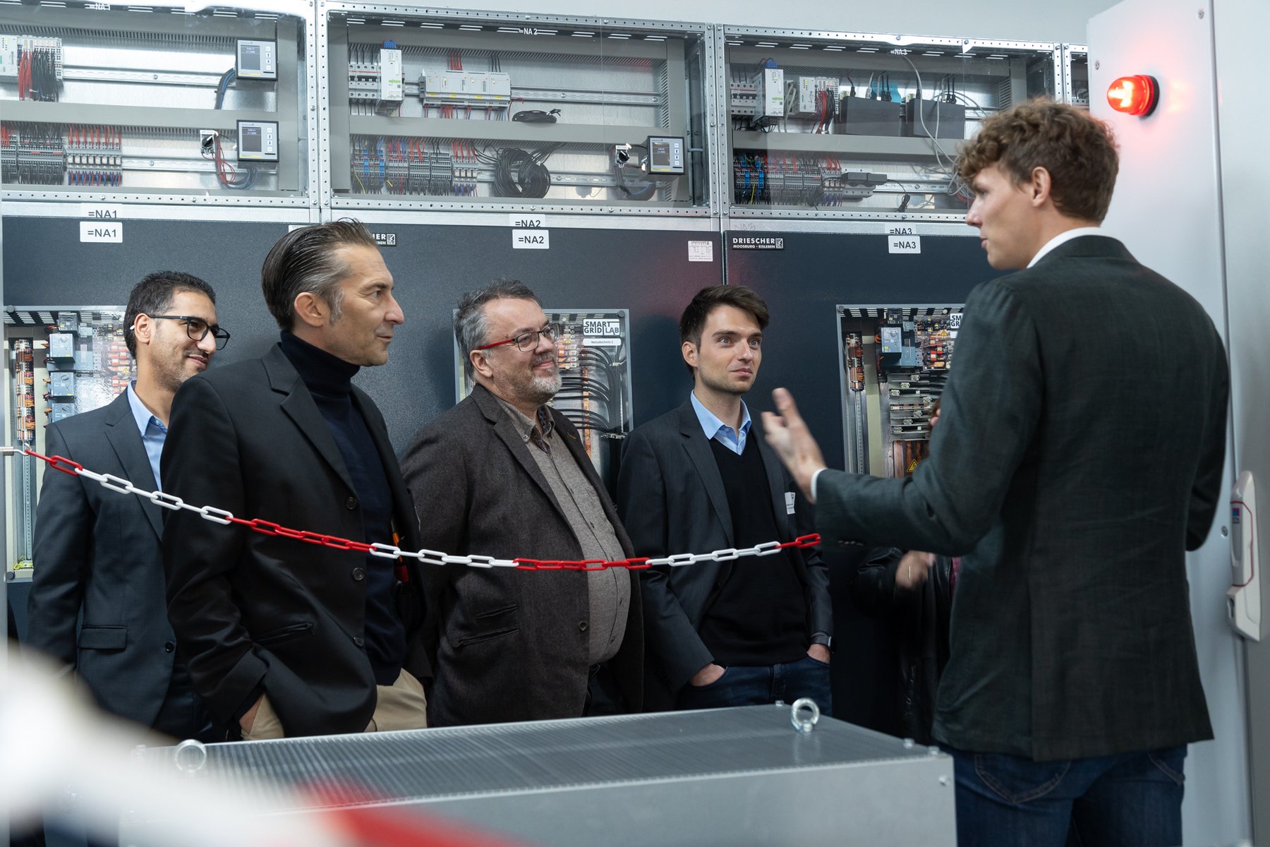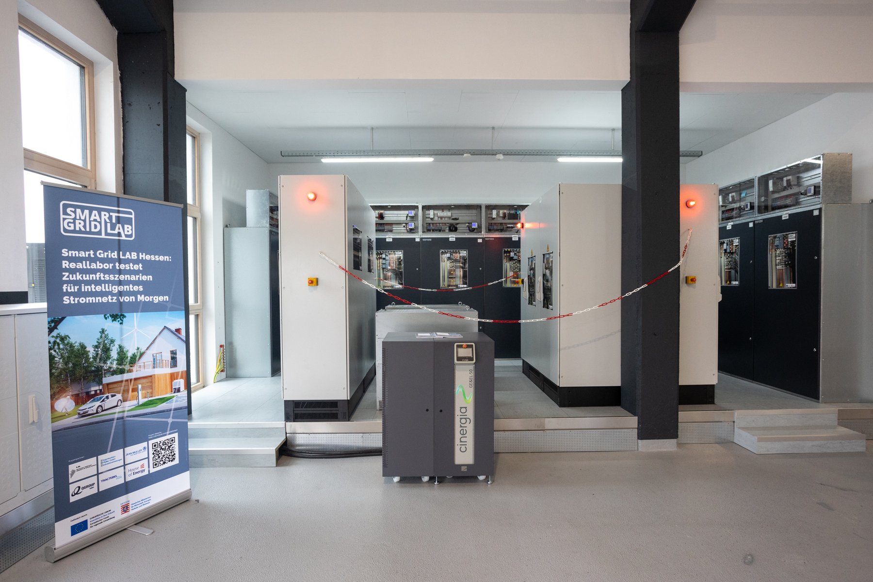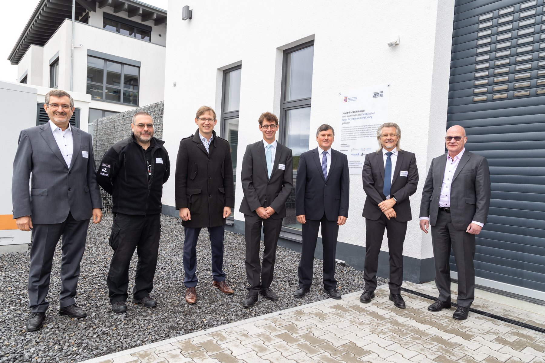 In front of the real lab (from left): Prof. Dr. Peter Birkner (House of Energy), Thomas Blumenthal (QGroup), State Secretary Jens Deutschendorf (Hessian Ministry of Economics), Prof. Dr. Ingo Jeromin (Darmstadt University of Applied Sciences), Dr. Ralf Bucher (Tractebel), Matthias Pfeffer (Ingenieurbüro Pfeffer), Heinz Saure (JEAN MÜLLER)