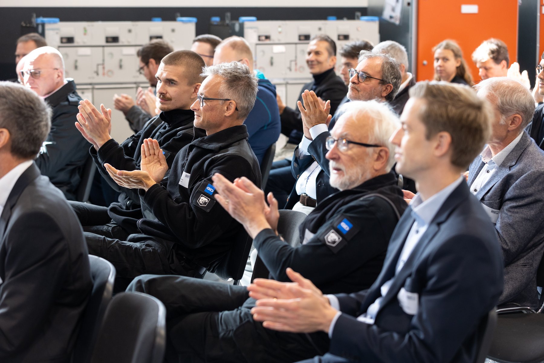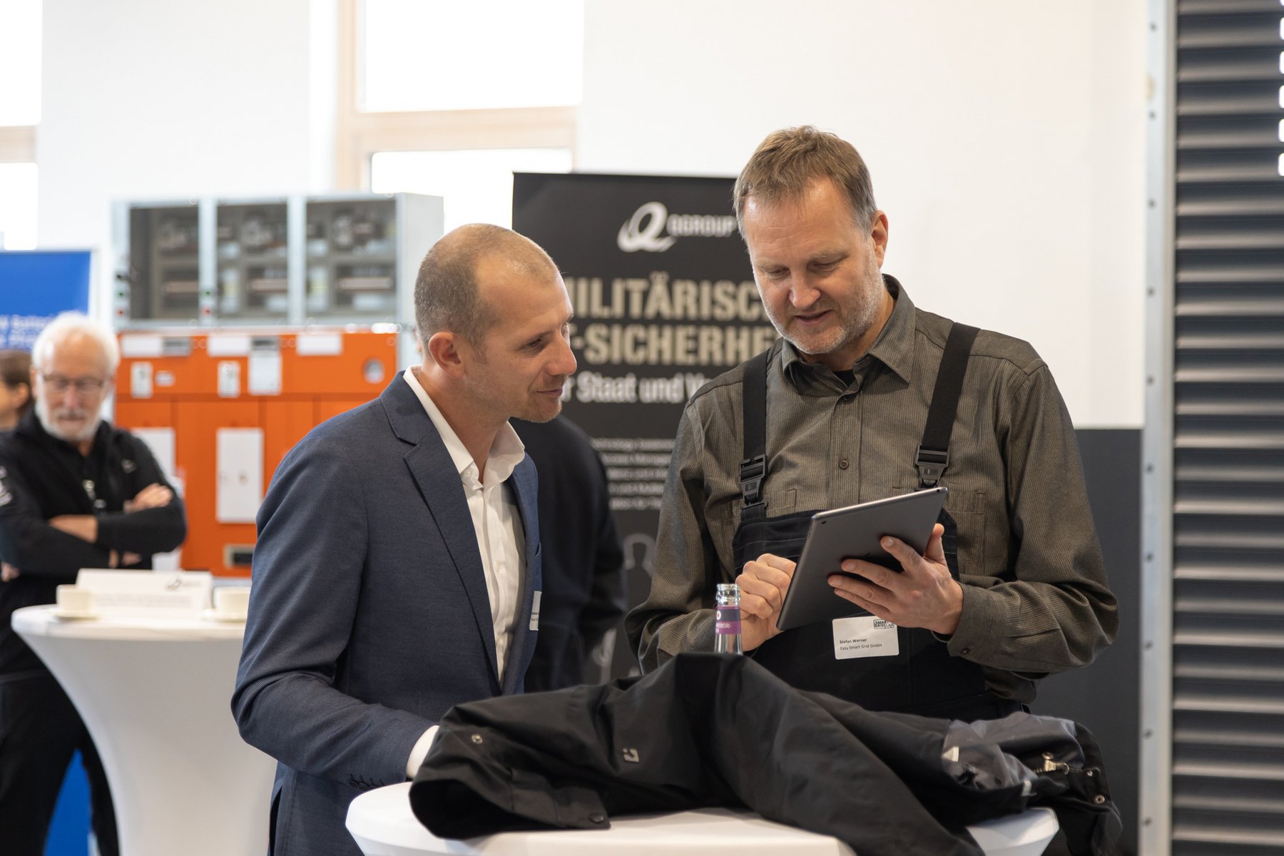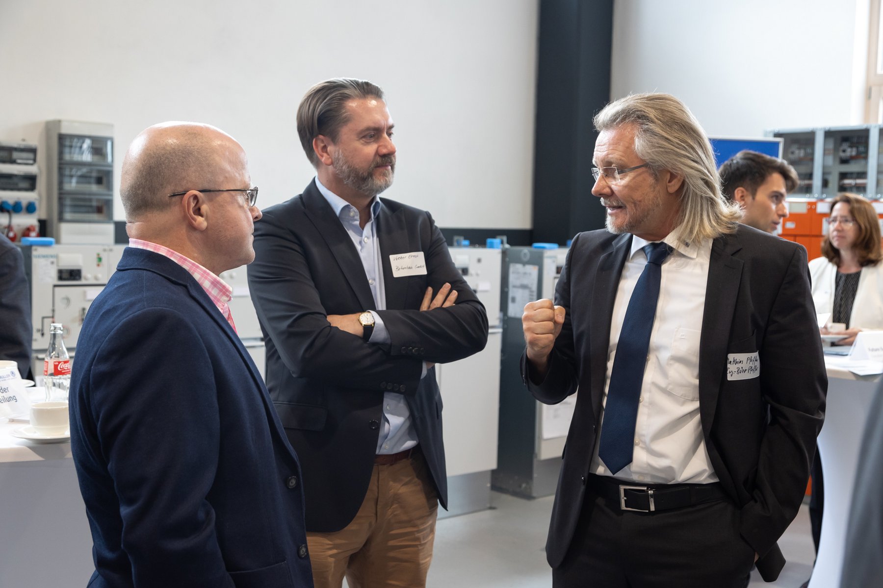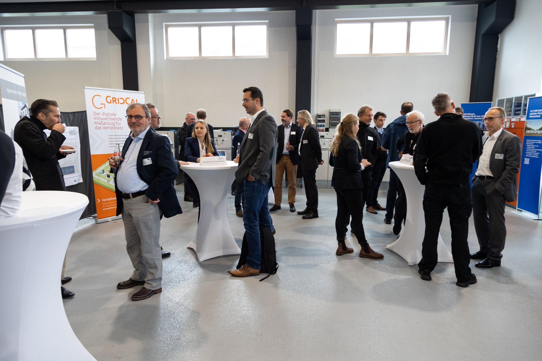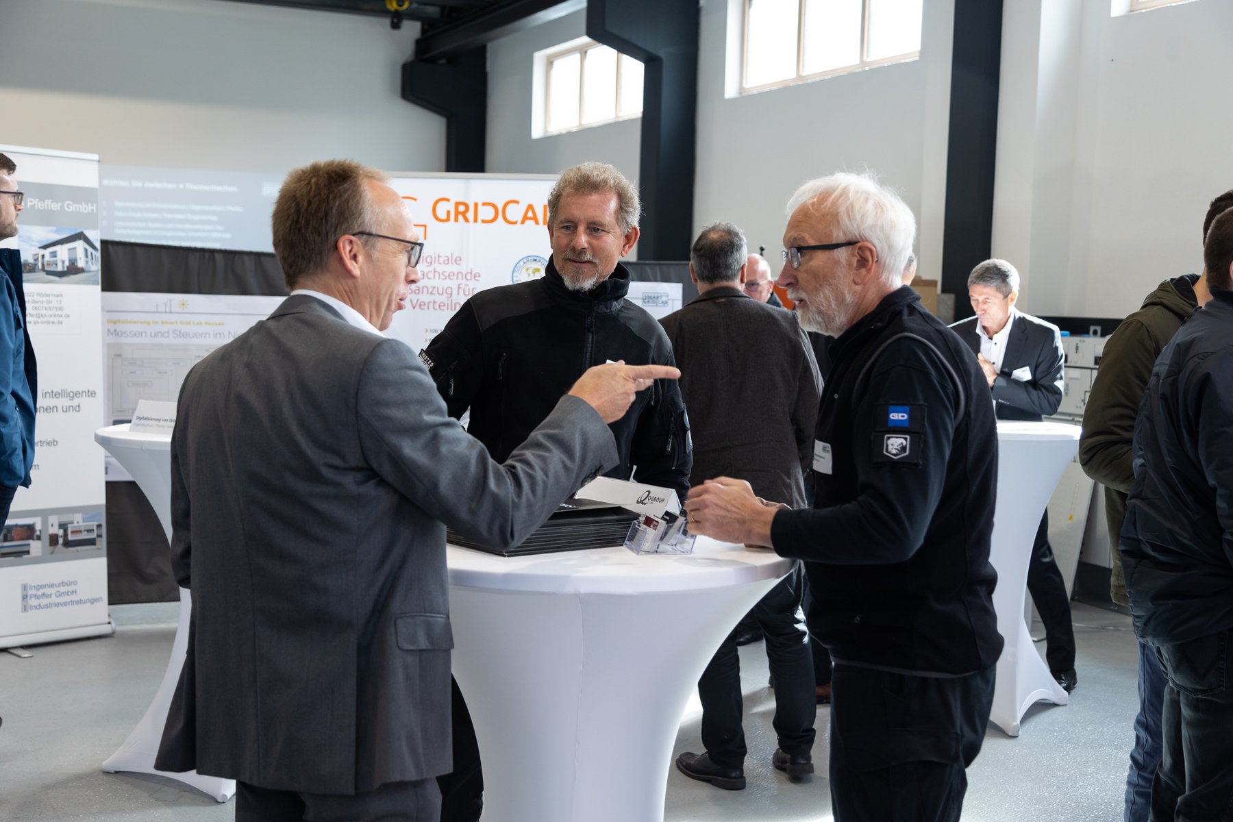 In front of the real lab (from left): Prof. Dr. Peter Birkner (House of Energy), Thomas Blumenthal (QGroup), State Secretary Jens Deutschendorf (Hessian Ministry of Economics), Prof. Dr. Ingo Jeromin (Darmstadt University of Applied Sciences), Dr. Ralf Bucher (Tractebel), Matthias Pfeffer (Ingenieurbüro Pfeffer), Heinz Saure (JEAN MÜLLER)