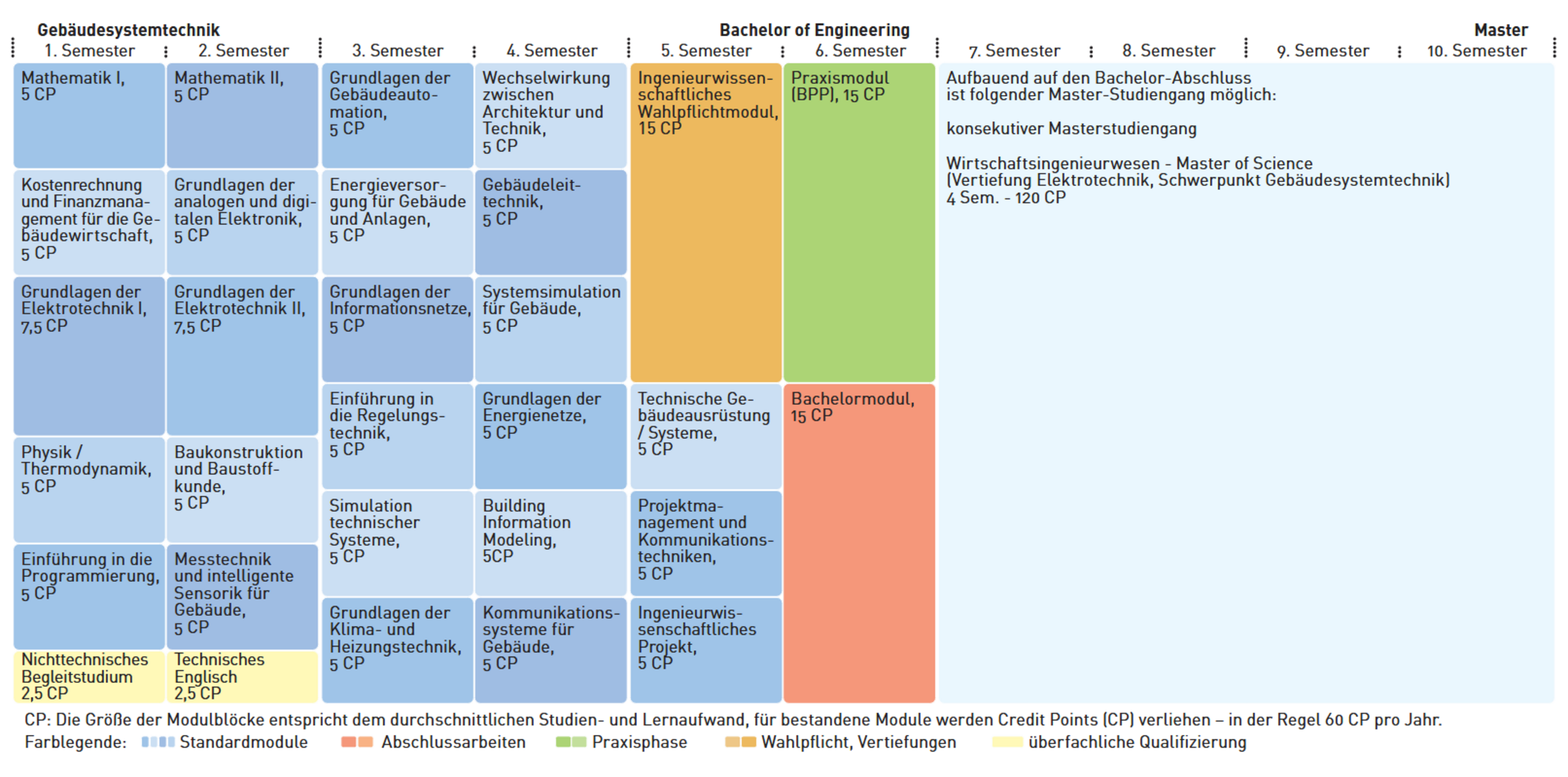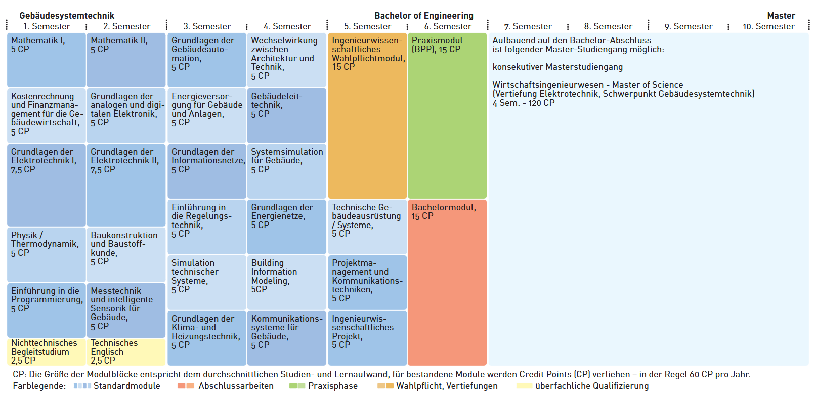 Das Studium der Gebäudesystemtechnik: Energieeffiziente Wohn- und Gebäudetechnologie umfasst sechs Semester Regelstudienzeit. Es enthält ein betreutes Praxisprojekt (BPP) sowie eine Bachelorarbeit. Der Studiengang ist modular aufgebaut, wobei jedem Modul je nach Umfang Creditpoints (CP) zugeordnet sind. Diese entsprechen den ECTS-Punkten des European Credit Transfer Systems, die Anerkennung von Studienleistungen im In- und Ausland erleichtern.